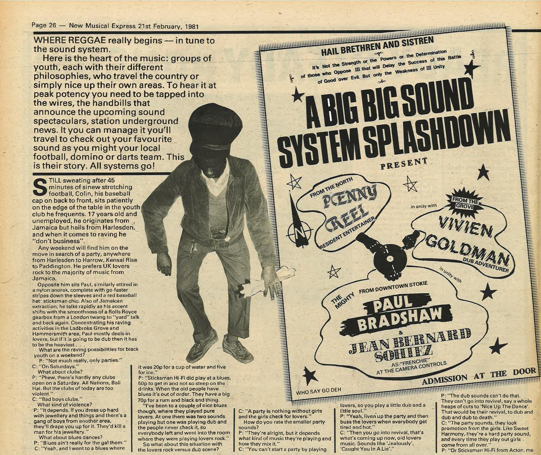 to Harrow, Opposite him sits Paul, similarly attired in a nylon anorak, complete with go-faster stripes down the sleeves arid a red baseball hat: sticksman chic. Also of Jamaican extraction, he talks rapidly as his accent shifts with the smoothness of a Rolls Royce gearbox from a London twang to "yard" talk and back again, concentrating his raving activities in the Ladbroke Grove and Hammersmith area, Paul mostly deals in lovers, but if it is going to be dub then it has to be the heaviest. What are the raving possibilities for black youth on a weekend? P: Not much really, only parties." C: "On Saturdays." What about clubs? P: "Phew, theres hardly any clubs open on a Saturday. All Nations, Bali Hai. But the clubs of today are too violent." C: "Bad boys clubs." What kind of violence? P: "It depends. If you dress up hard with jewellery and things and theres a gang of boys from another area, theyll drape you up for it. Theyd kill a man for his jewellery." What about blues dances? P: "Blues aint really for the gal them." C: "Yeah, and I went to a blues where it was 20p for a cup of water and five for ice." P: "Sticksman Hi-Fi did play at a blues, 50p to get in and not so steep on the drinks. When the old people have blues its out of order. They have a big 70p for a rum and black and thing. "Ive been to a couple of nice blues though, where they played pure lovers. At one there was two sounds playing but one was playing dub and the people never check it, so everybody left and went into the room where they were playing lovers rock." So what about this situation with the lovers rock versus dub scene? C: "A party is nothing without girls and the girls check for lovers." How do you rate the smaller party sounds? P: "Theyre alright, but it depends what kind of music theyre playing and how they mix it." C: "You cant start a party by playing lovers, so you play a little dub and a little soul." P: "Yeah, liven up the party and then buss the lovers when everybody get tired and hot." C: "Then you go into revival, thats whats coming up now, old lovers music. Sounds like Jealously, Caught You In A Lie." P: "The dub sounds cant do that. They cant go into revival, say a whole heaps of cuts to Nice Up The Dance. That would be their revival, to dub and dub and dub to death." C: "The party sounds, they look promotion from the girls. Like Sweet Harmony, theyre a hard party sound, and every time they play out girls come from all over." P: "Or Sticksman Hi-Fi from Acton, me a tell yuh."
